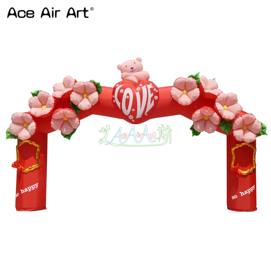 New designed red inflatable love heart arch with bear and flowers decoration for wedding/event/vale